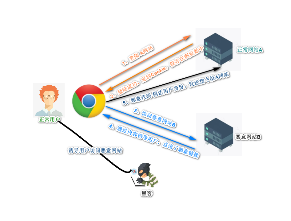 CSRF,即跨站点请求伪造(Cross-Site Request Forgery),。其原理在于攻击者盗用用户身份,以用户名义向服务器发送恶意请求。这些请求在服务器看来完全合法,却能执行攻击者预期的操作,如发送邮件、发布消息、盗取账号、添加系统管理员等危险操作。