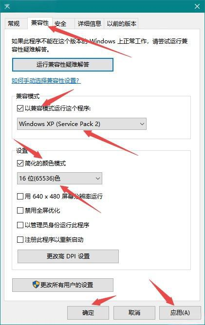 3、接着勾选【以兼容模式运行这个程序】选项,并将下方的选项选择为【WindowsXP】,然后在勾选【简化的颜色模式】功能,并将下方的选项选择为【16位】,最后点击【应用】再点击【确定】按钮即可。