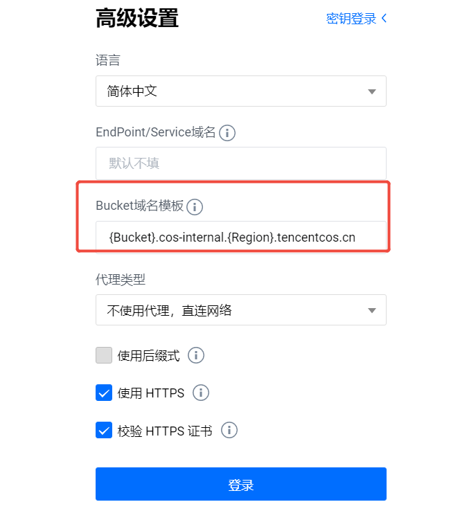 cos内网登录,有时候只在上图红色圈出的位置填上{Bucket}.cos-internal.{Region}.tencentcos.cn、在下图红色圈出的地方不填bucket和region就可以,有时候,必须填一下bucket和region才能识别,否则可能会报"网络不通,请检查网络和代理配置"。为了提升cosbrowser内网登录的健壮性,建议上下两张图红色圈出的位置都填写。
