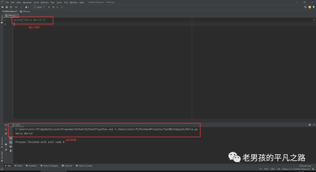 配置完成后,新建一个python文件(左侧目录树,右键New->Python File),输入HelloWorld代码,运行,查看结果,打印成功。