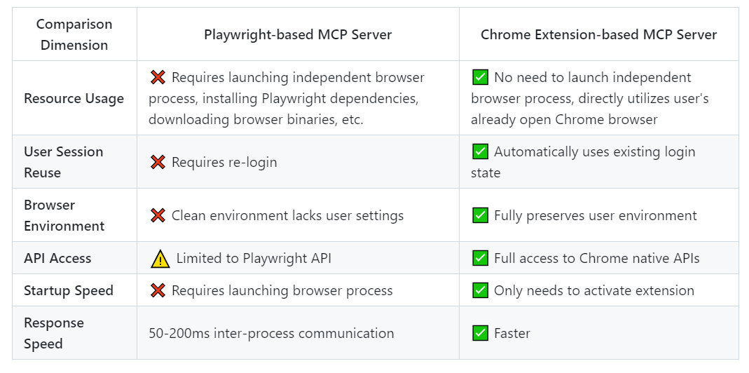 与传统的浏览器自动化工具(如 Playwright、Selenium)不同,Chrome MCP Server 直接使用用户日常使用的 Chrome 浏览器,保留登录状态、配置和扩展,确保隐私,支持本地运行和流式 HTTP 连接 。