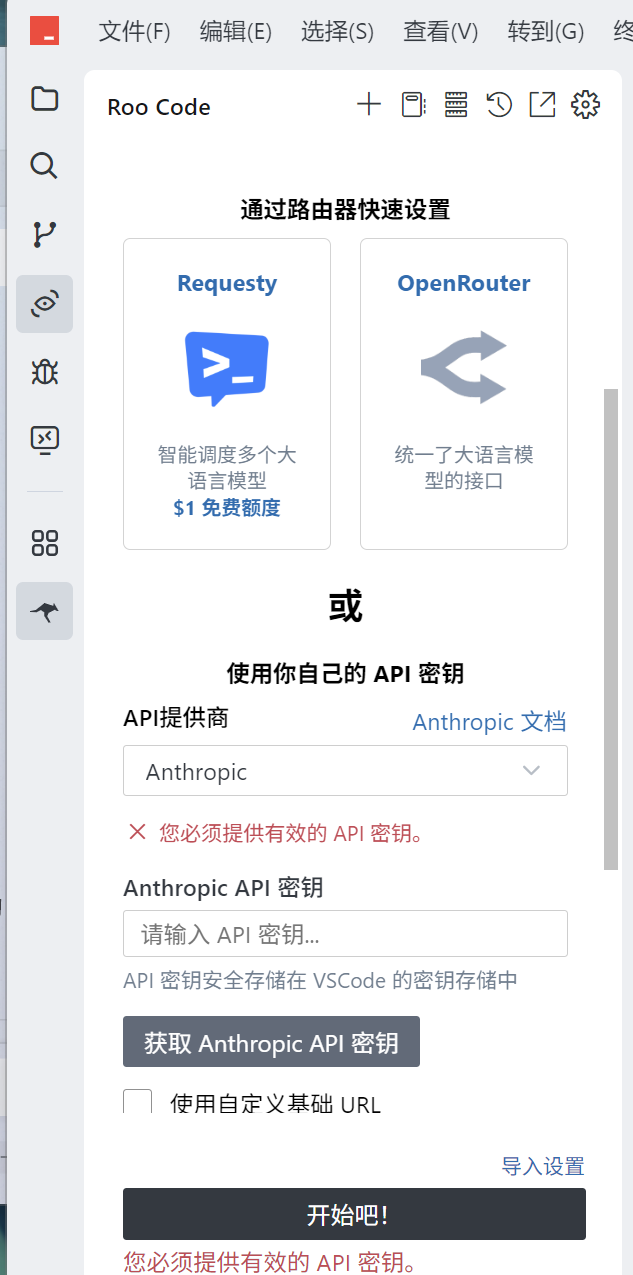 安装完成后,进行插件的初始化配置。系统提供了两种API Key配置方式: