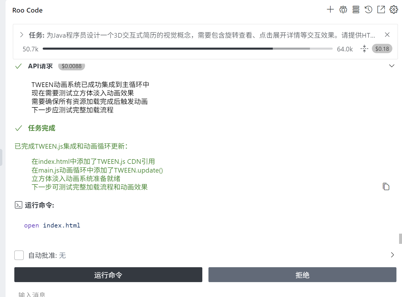 整个过程中,我们为了验证 Roo Commander 的效果,对所有操作都直接批准,不做任何人工干预。