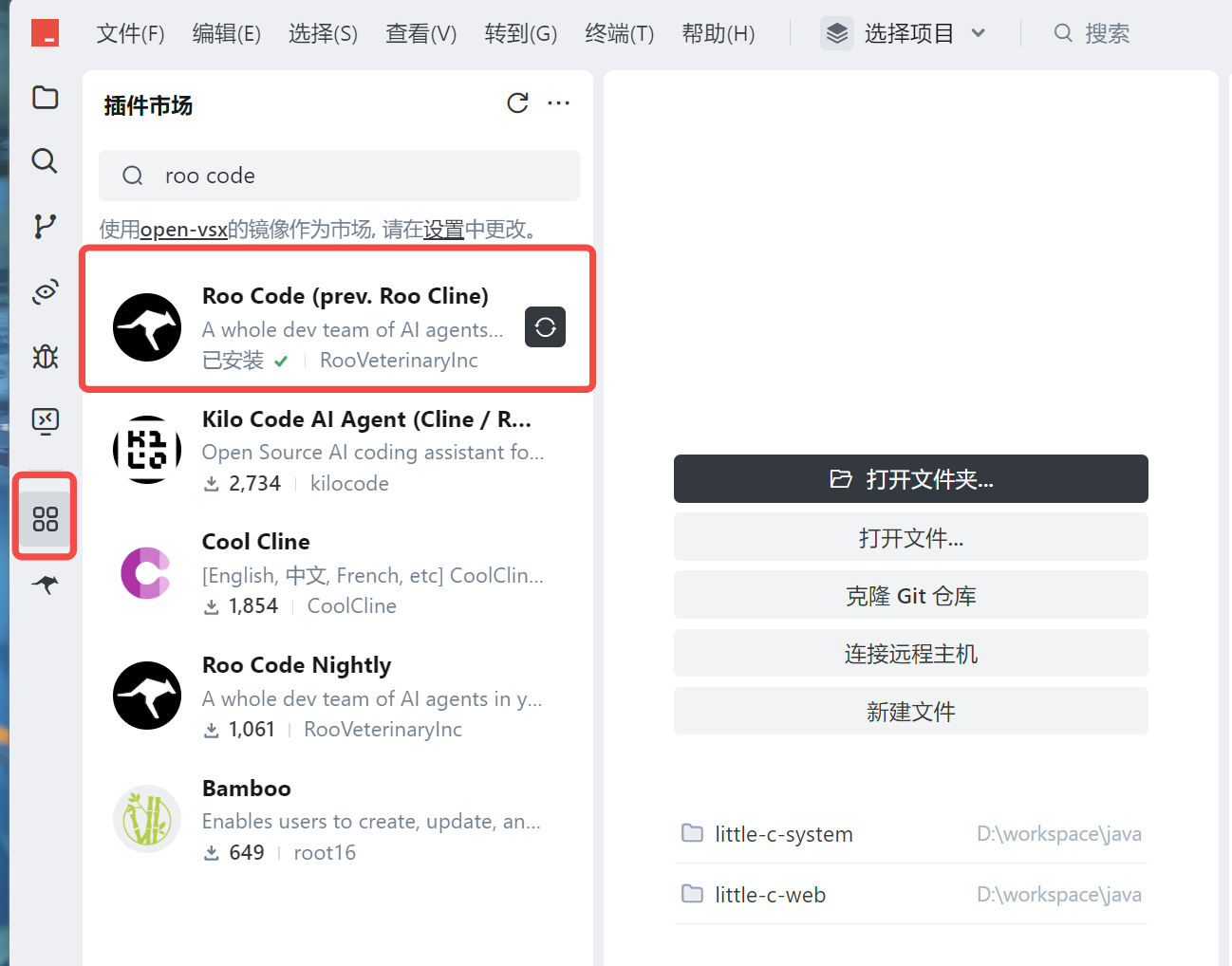 首先,我们需要在IDE中安装Roo Code插件。本文以Trae为例(您也可以使用VS Code等其他支持的IDE),直接在插件市场搜索Roo Code并安装即可。