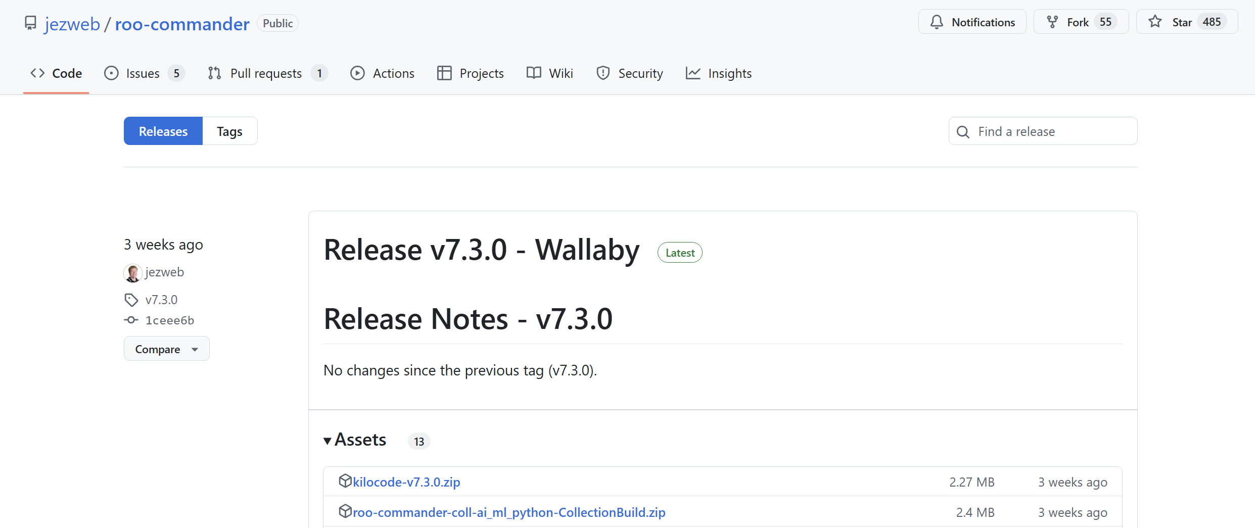 访问Roo Commander发布页面下载最新版本。截止这篇文章完成的时候,v7.3.0是最新的版本,如果各位读者想尝试,尽量选择最新版。