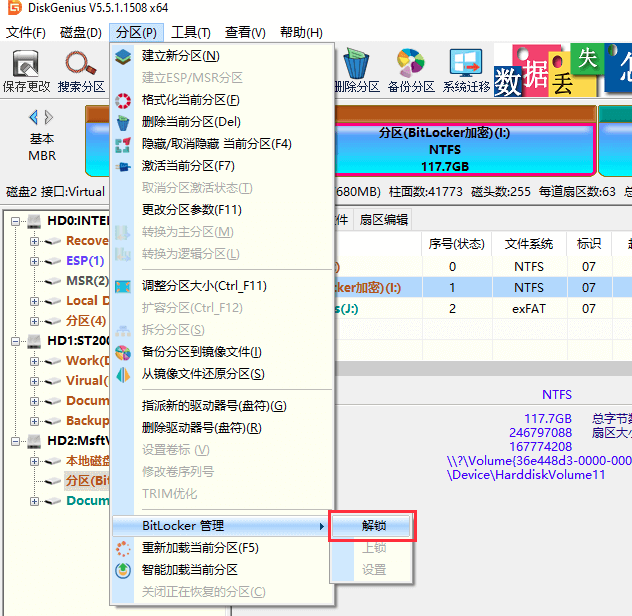2. 如果BitLocker分区处于加密状态,那么就尝试解锁:右击目标分区 - 选择“BitLocker 管理” - “解锁”。