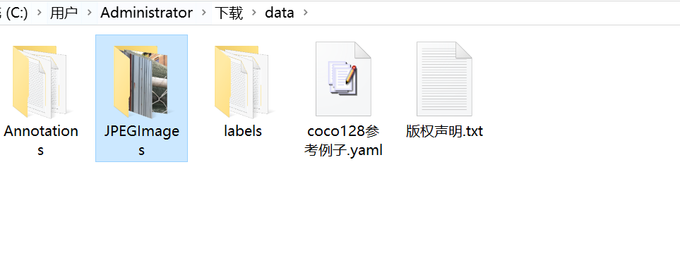 然后将数据集压缩包解压到一个非中文和空格路径下面,比如我解压的到C:\Users\Administrator\Downloads,由于使用yolo训练数据集,因此Annotations文件夹用不上可以放一边。
