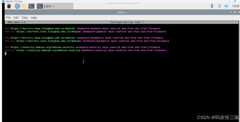 进入该文件编辑,将里面的内容用清华源的内容覆盖掉,保存退出。(Ctrl+X键入Y,回车保存)