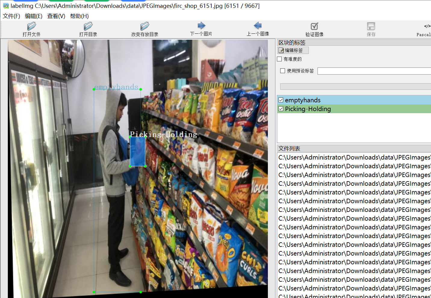 标注类别名称:["Basket","Looking around","Picking-Holding","Robbery","emptyhands","shoplifting"]