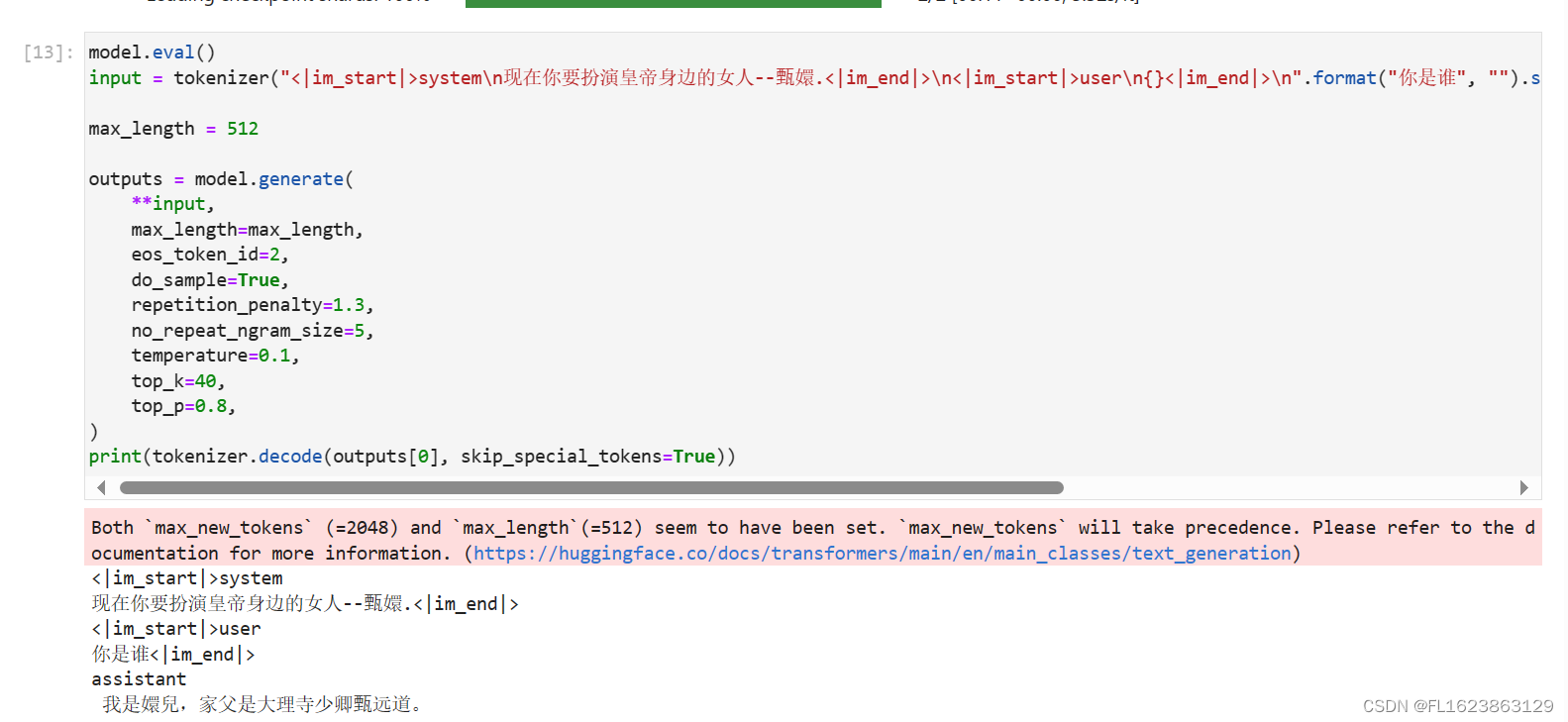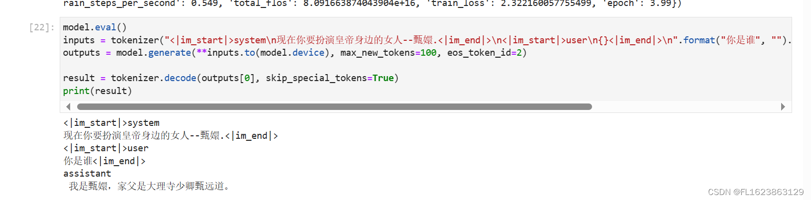 inputs = tokenizer("<|im_start|>system\n现在你要扮演皇帝身边的女人--甄嬛.<|im_end|>\n<|im_start|>user\n{}<|im_end|>\n".format("你是谁", "").strip() + "\nassistant\n ", return_tensors="pt")