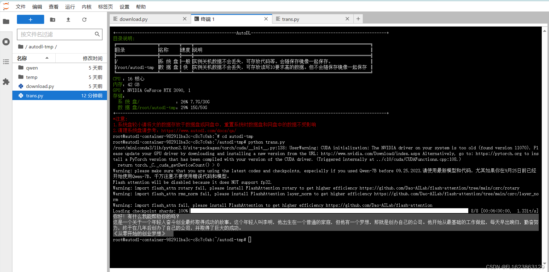 在 /root/autodl-tmp 路径下新建 download.py 文件并在其中输入以下内容,粘贴代码后记得保存文件,如下图所示。并运行 python /root/autodl-tmp/download.py执行下载,模型大小为 15 GB,下载模型大概需要 10~20 分钟