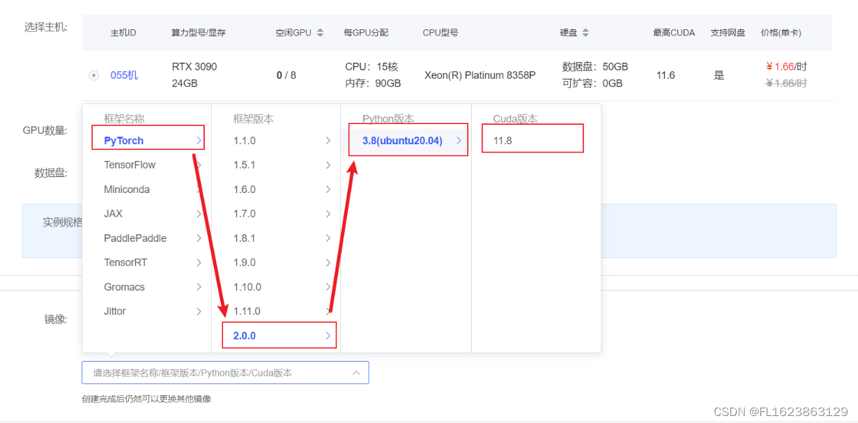 在autodl平台中租一个3090等24G显存的显卡机器,如下图所示镜像选择PyTorch–>2.0.0–>3.8(ubuntu20.04)–>11.8