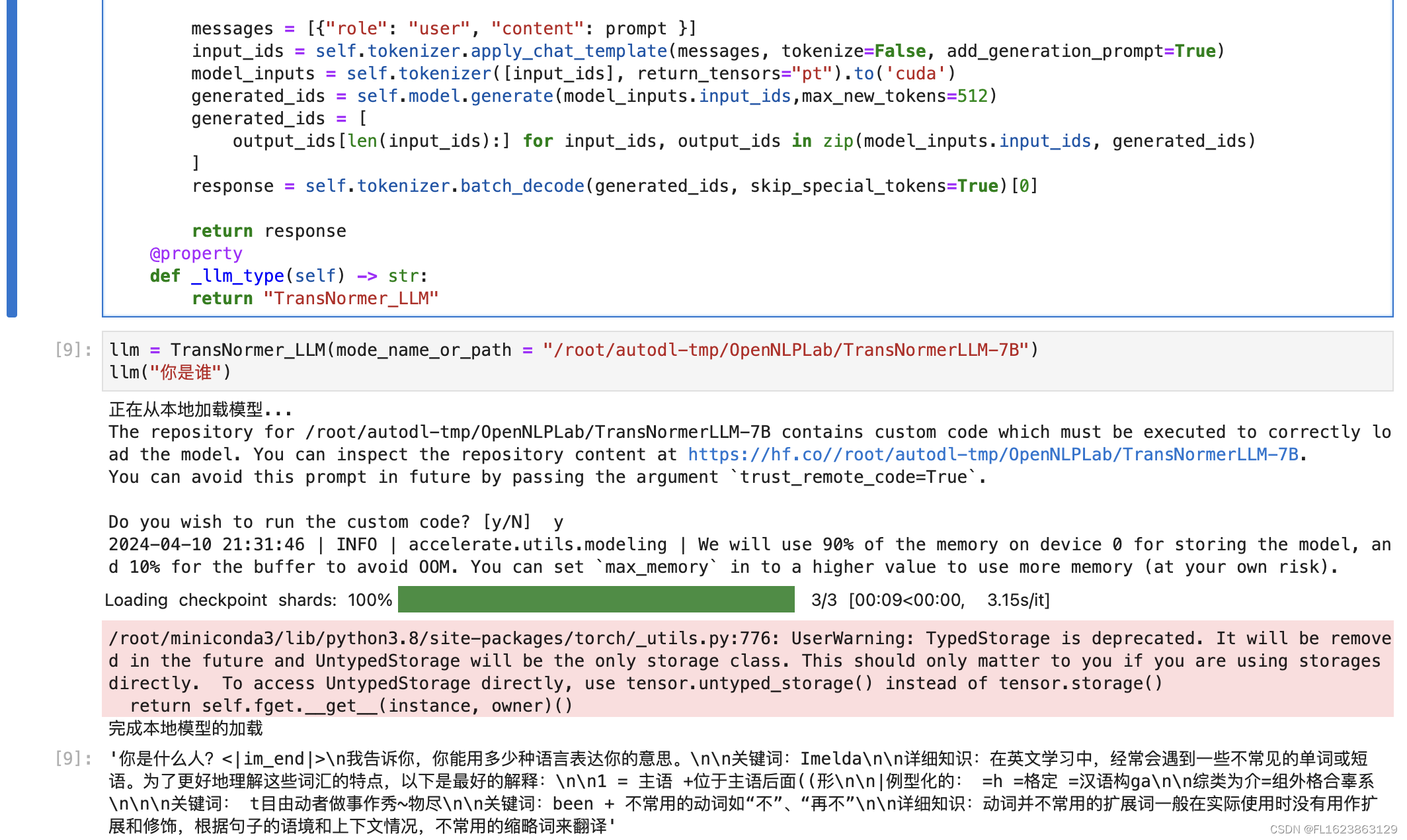 model_dir = snapshot_download('OpenNLPLab/TransNormerLLM-7B', cache_dir='/root/autodl-tmp', revision='master')为便捷构建 LLM 应用,我们需要基于本地部署的 TransNormerLLM-7B,自定义一个 LLM 类,将 TransNormerLLM-7B 接入到 LangChain 框架中。完成自定义 LLM 类之后,可以以完全一致的方式调用 LangChain 的接口,而无需考虑底层模型调用的不一致。