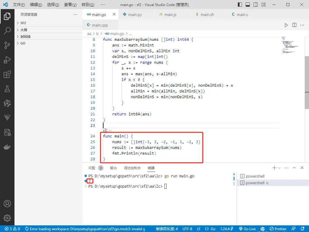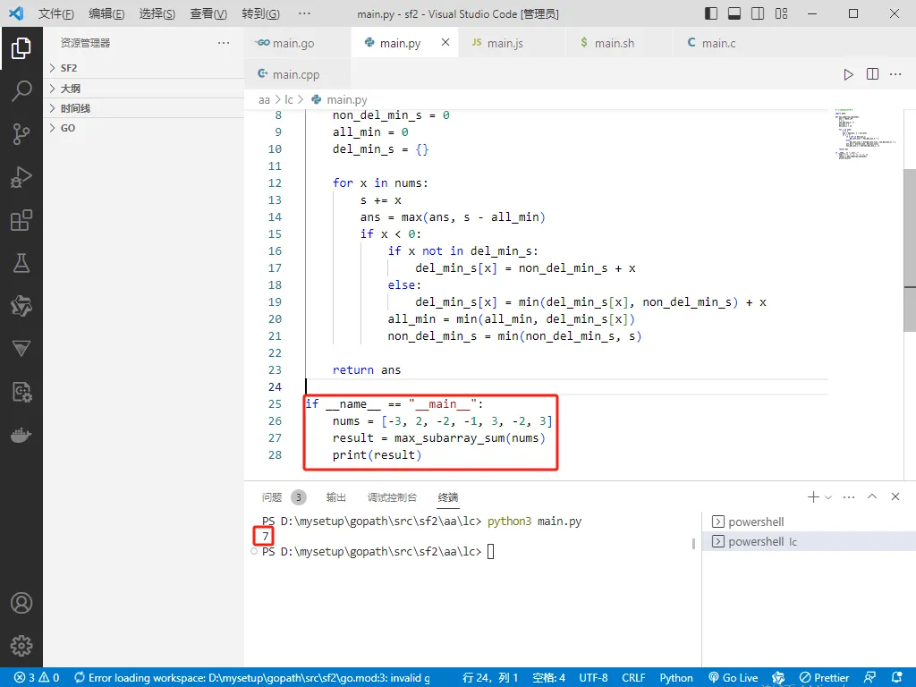 删除所有 X = -2 后得到 nums = [-3, 2, -1, 3, 3] 。最大子数组和为 2 + (-1) + 3 + 3 = 7 。
