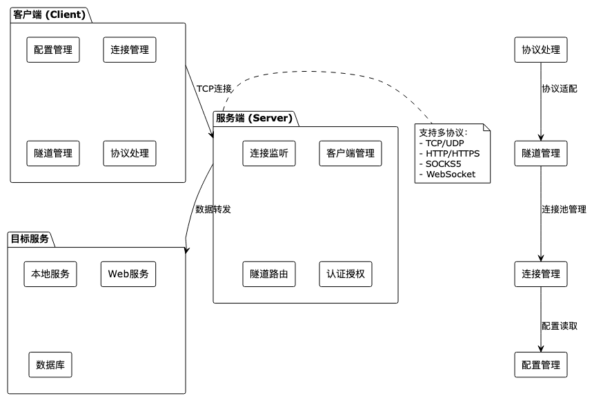 客户端负责建立与服务端的连接,并根据配置启动相应的隧道服务。