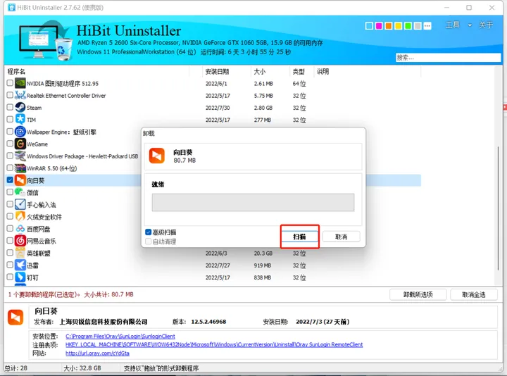 卸载完成后,还有一些残留文件需要删除,点击“扫描”就可以了