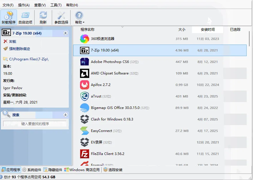 智能分类与排序:Uninstall Tool将已安装的程序分为软件、系统和隐藏三类,并提供按软件名称、占用空间和安装日期等多种排序方式,方便用户查找和管理。