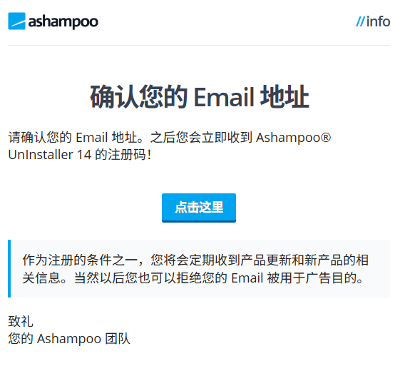 2、点击确认Email 地址。之后您会立即收到 Ashampoo® UnInstaller 14 的注册码!