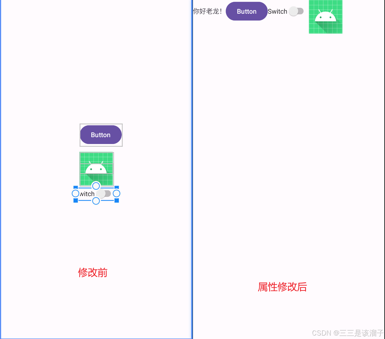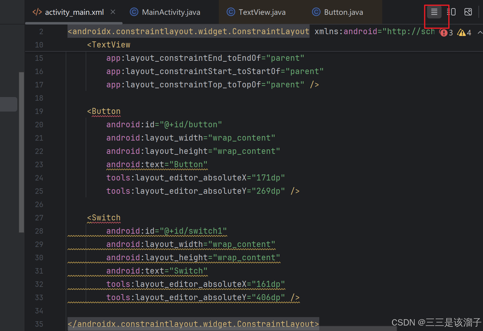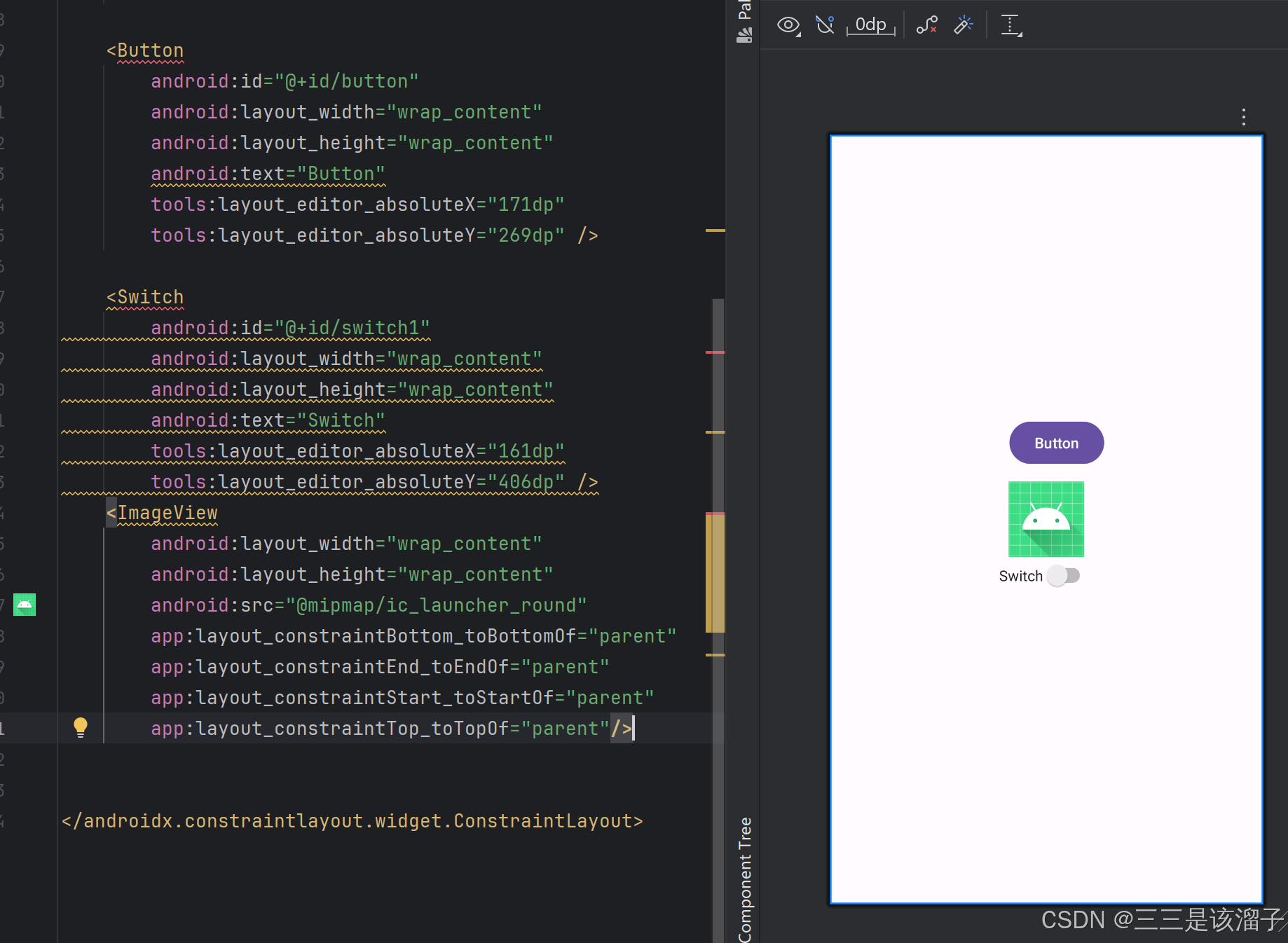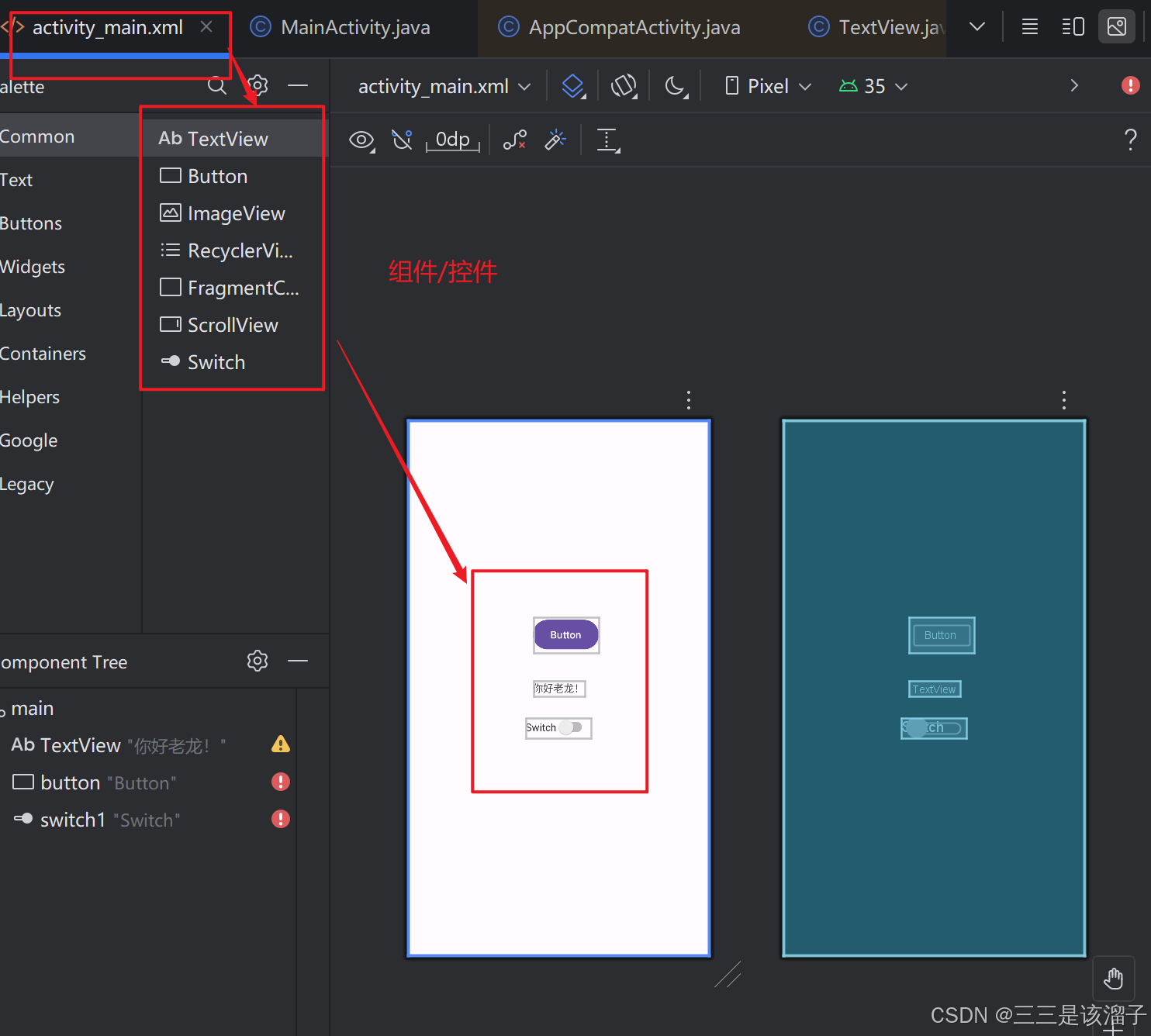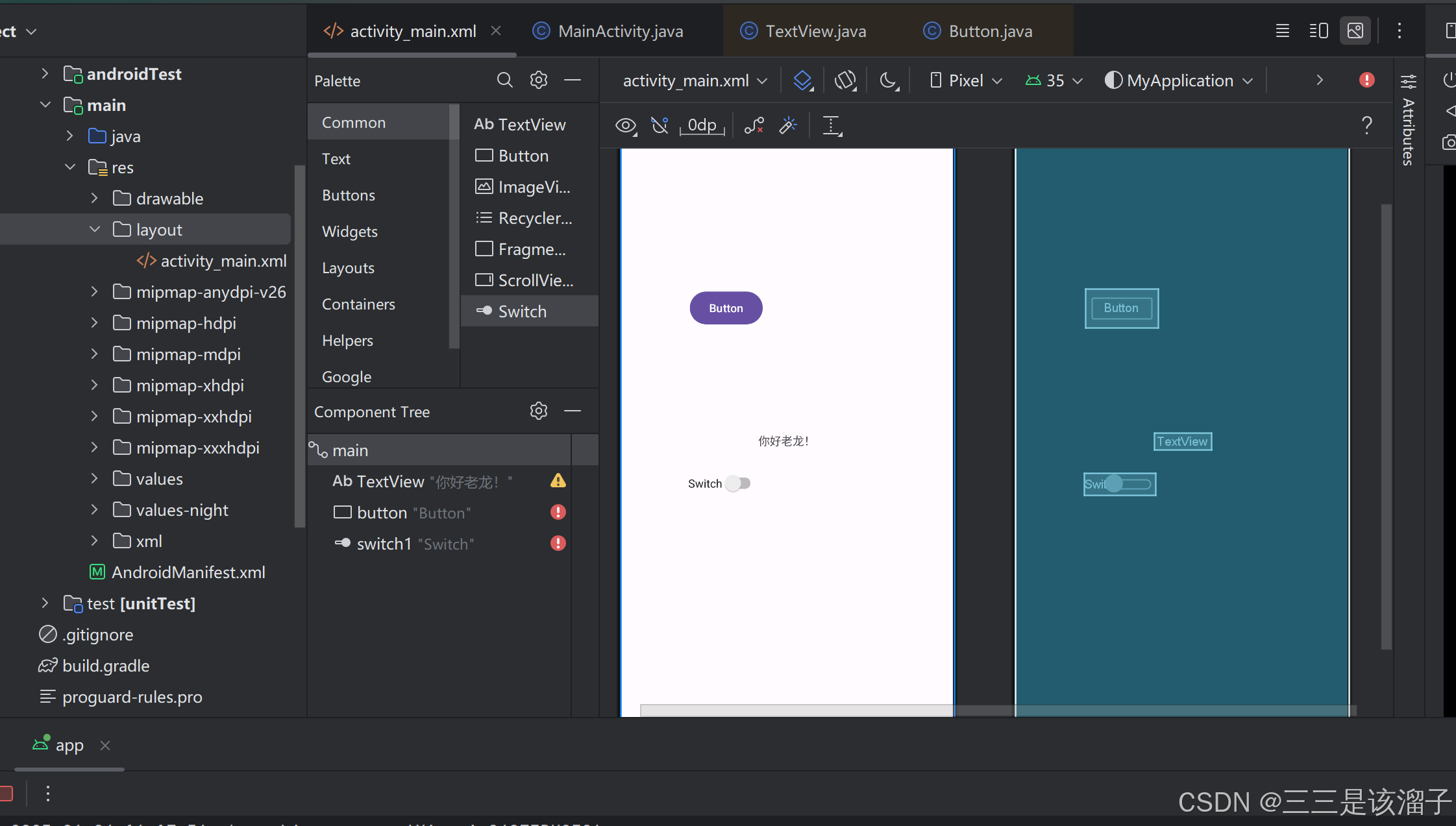 我们可以在activity_main.xml中声明控件,比如说button,switch(前面的路以后再来探索吧QWQ)