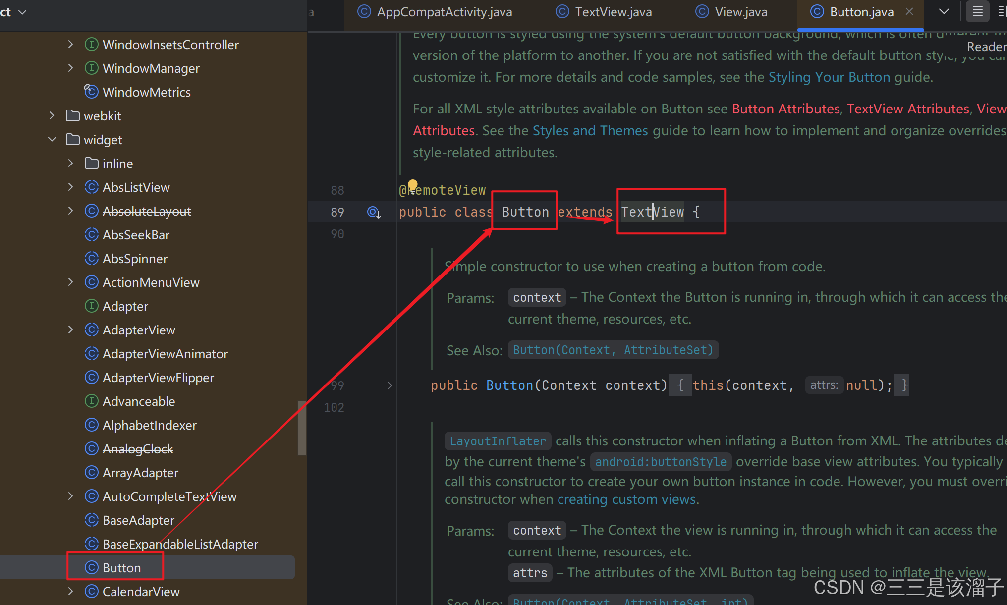这些控件本质上都是xml代码,右上角可以切换code代码。 Android会为view以及它的子类,提供xml的引用形式