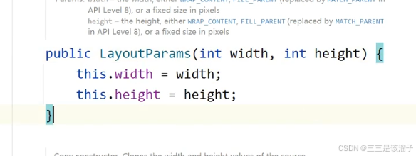 int w = ViewGroup.LayoutParams.MATCH_PARENT;//MATCH_PARENT代表控件宽度会填满父容器