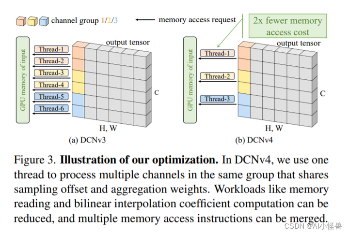 图3。说明我们的优化。在DCNv4中,我们使用一个线程来处理同一组中的多个通道,这些通道共享采样偏移量和聚合权重。可以减少内存读取和双线性插值系数计算等工作负载,并且可以合并多个内存访问指令。