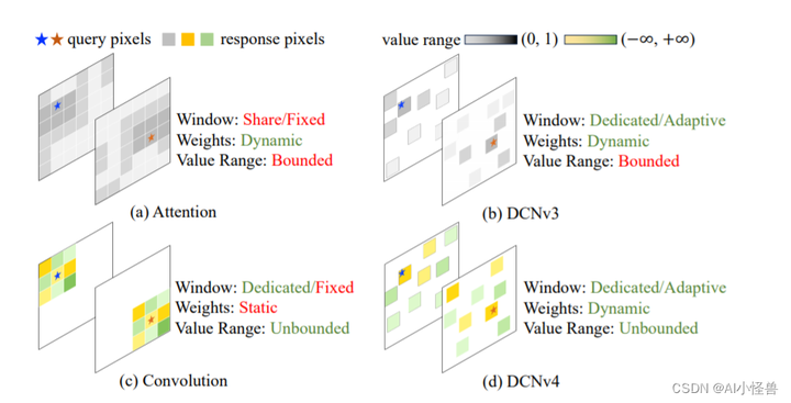图2。(a)注意力(Attention)和(b) DCNv3使用有限的(范围从0 ~ 1)动态权值来聚合空间特征,而注意力的窗口(采样点集)是相同的,DCNv3为每个位置使用专用的窗口。(c)卷积对于聚合权值具有更灵活的无界值范围,并为每个位置使用专用滑动窗口,但窗口形状和聚合权值是与输入无关的。(d) DCNv4结合两者的优点,采用自适应聚合窗口和无界值范围的动态聚合权值。