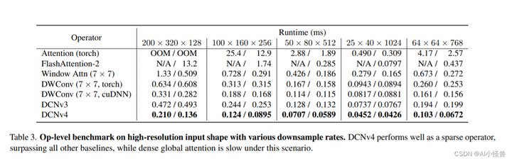 表3。具有各种下采样率的高分辨率输入形状的运算级基准。DCNv4作为稀疏算子表现良好,优于所有其他基线,而密集的全局关注在这种情况下速度较慢。