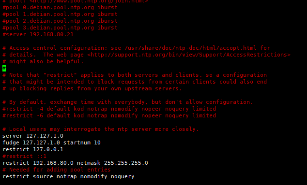 在/etc/ntp.conf中设置本机为ntpserver并允许192.168.80.0网段访问,如下