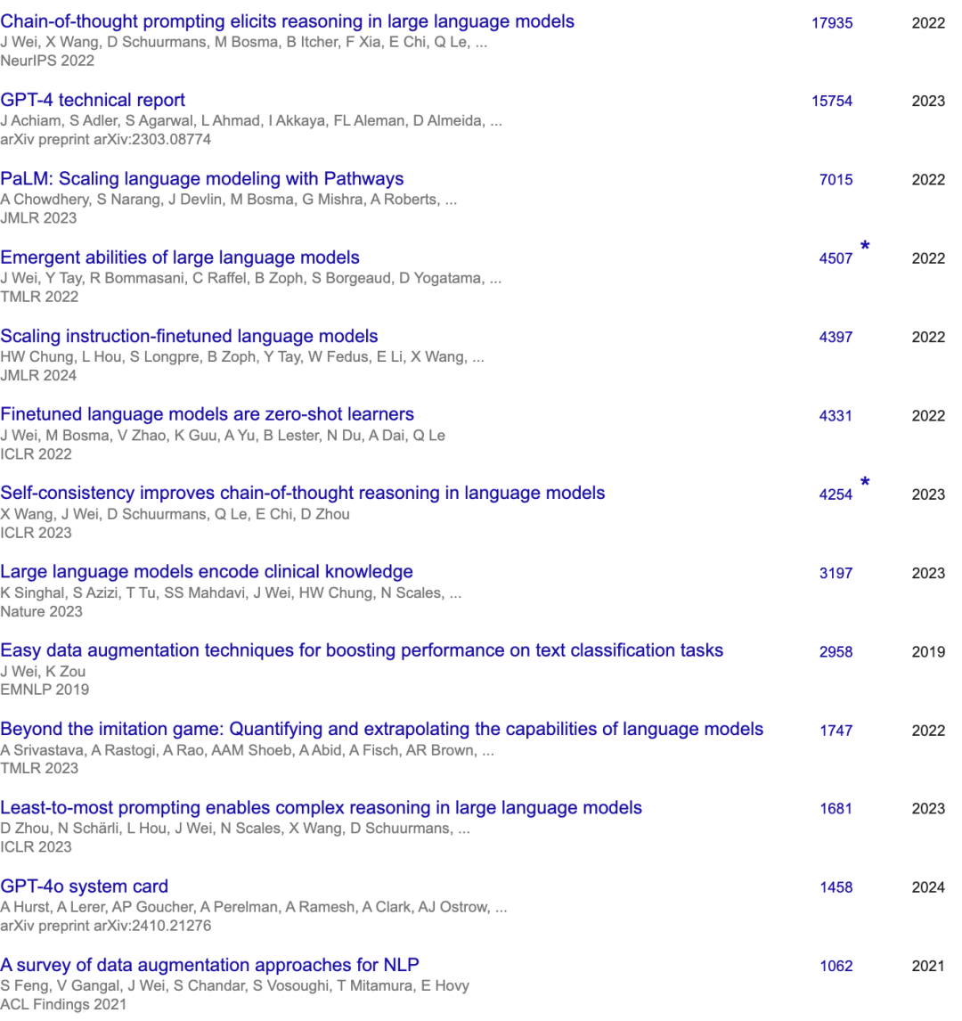 根据谷歌学术统计,他有13篇被引次数超过1000的论文,合作者包括Jeff Dean、Quoc V. Le等知名AI研究员,参与了OpenAI的GPT-4、GPT-4o、o1、深度研究等项目。