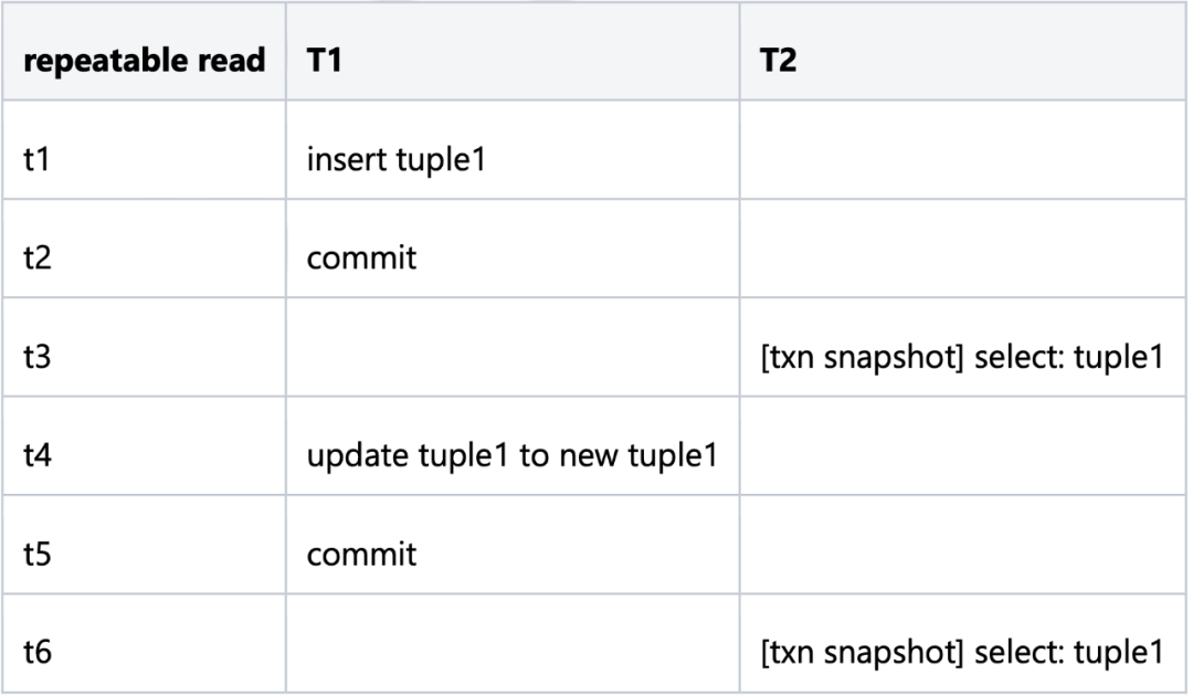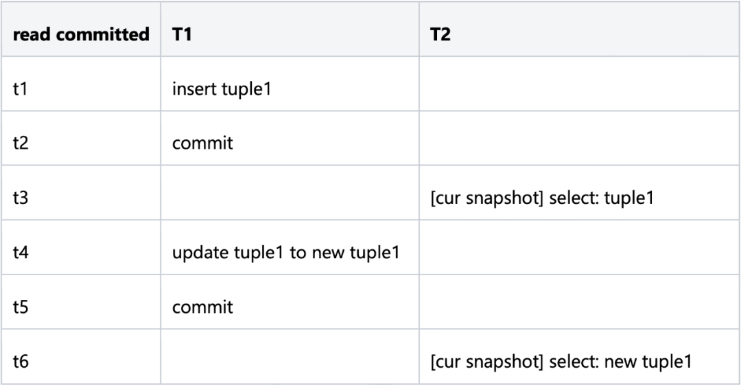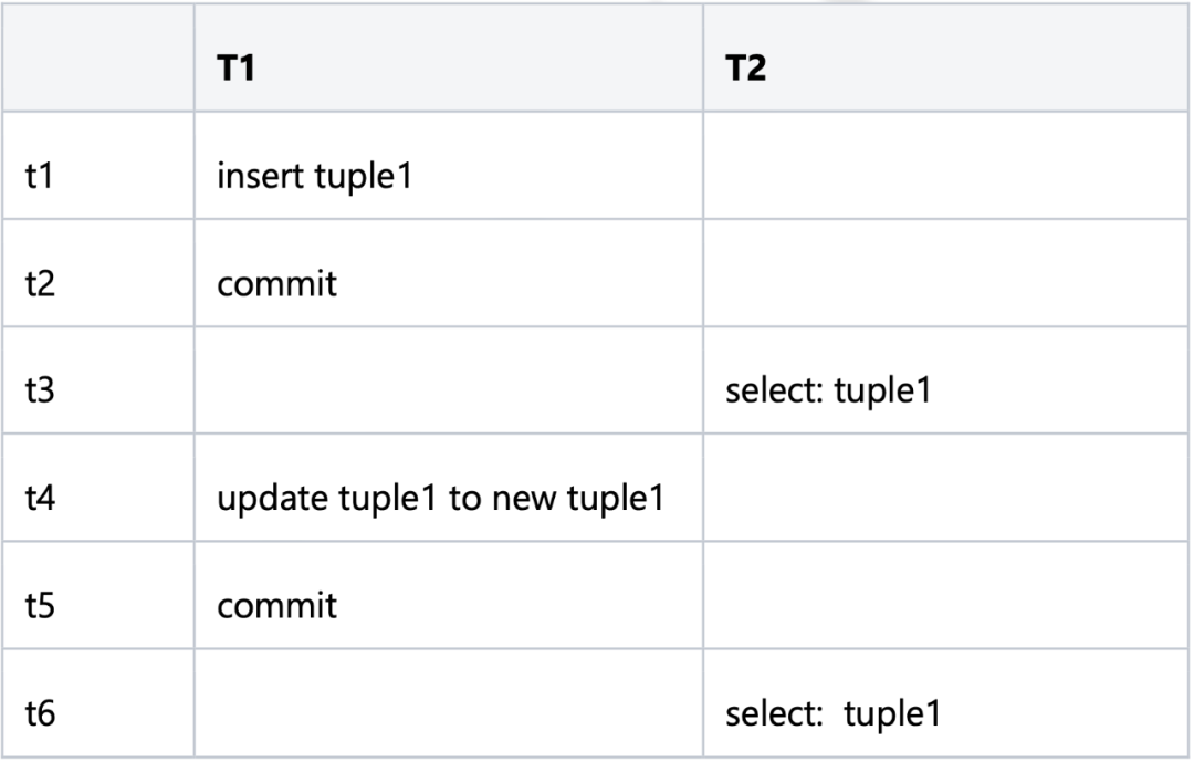 下例中,事务1在t4时刻对tuple1进行更新,产生了新版本的tuple1。事务2在t3时刻读到旧版本tuple1,在t6时刻读到新版本tuple1。