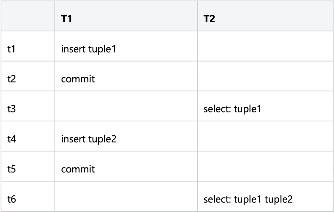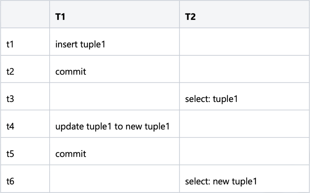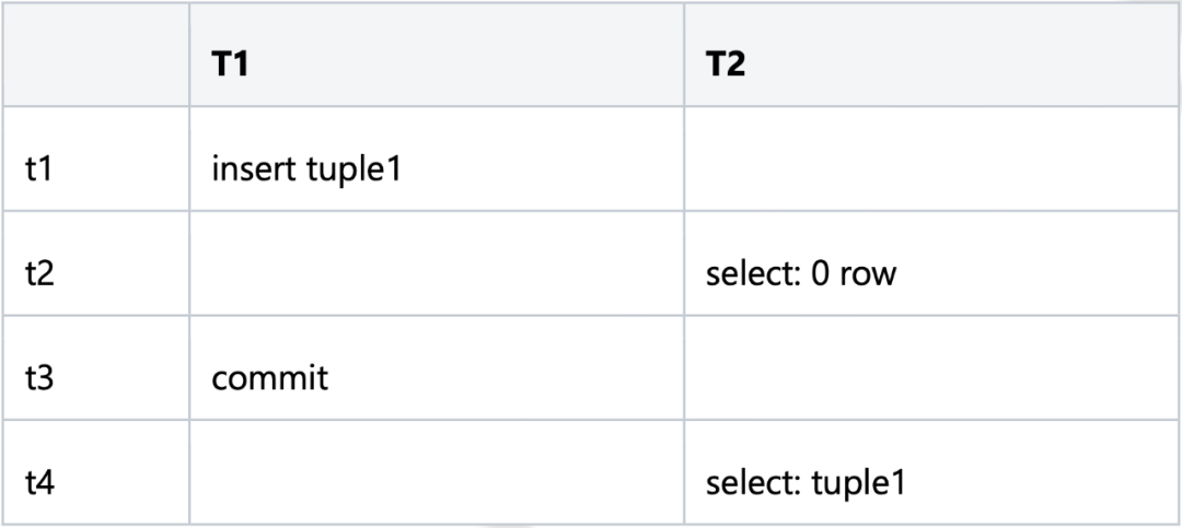 下例中,事务2在t2时刻读不到tuple1,在t4时刻才能读取tuple1,避免了脏读问题。