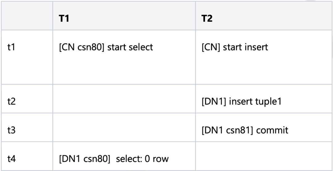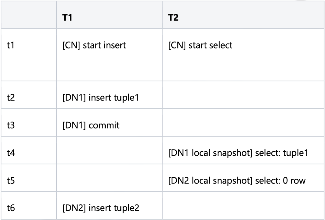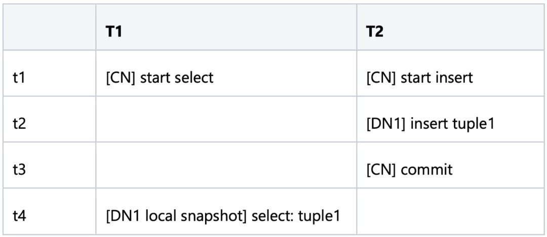 例1,因为网络延迟,事务1 t1时刻发起的查询请求等到t4时刻才到达DN1上,事务2 t2时刻的插入在t3时刻就已完成。使用本地快照会导致看到不应该看到的数据。
