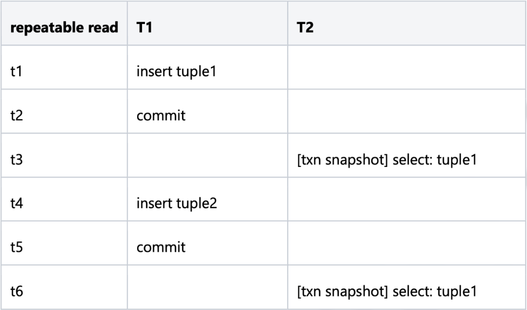 下例中,在t6时刻,因为事务快照看不到新插入的元组2,所以返回的数据仍只有元组1。因此避免了幻读