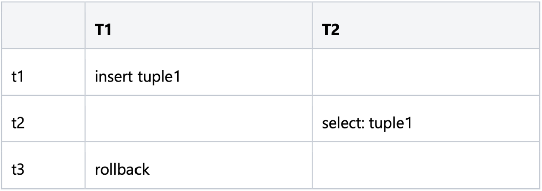 下例中,事务2读取了最终未提交的数据tuple1,出现脏读现象。