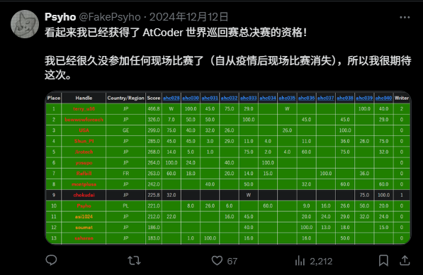 每一年,根据AtCoder全年举办的比赛成绩选出排名前12名的选手,邀请他们来到东京,决出世界冠军。