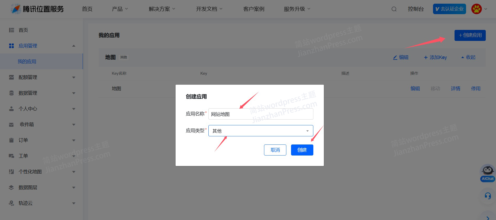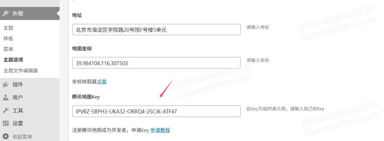 7、把这个Key复制到wordpress网站主题后台“主题选项”-“基础设置”-“腾讯地图Key”的位置,再点“保存”即可。