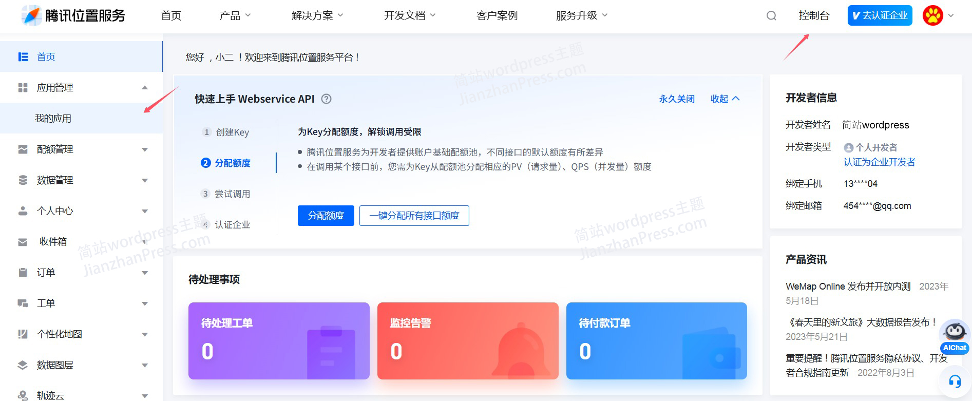 2、注册帐号成功后,到右上角找到“控制台”,进入对应的页面后找“应用管理”、“我的应用”