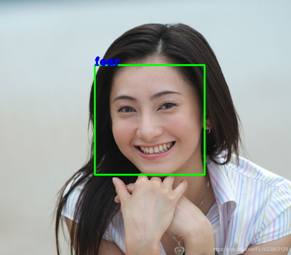 cv2.putText(img, emotion[np.argmax(prob)], (x, y), cv2.FONT_HERSHEY_COMPLEX, 1.0, (255, 0, 0), 3)