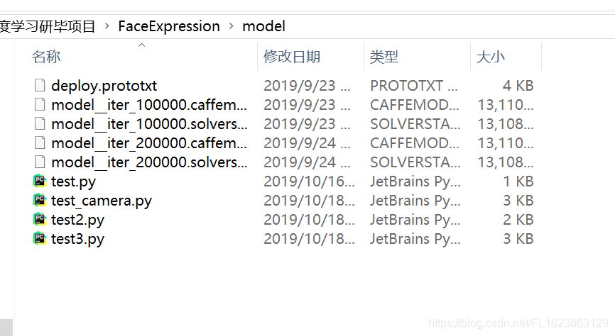这是模型文件和测试模型的代码,test是最简单的版本需要自己框人脸然后保存图片检测,test1.py是利用opencv人脸检测自动框人脸检测表情识别。test2.py是封装的类,这样简单易懂,test_camera是摄像头实时人脸表情检测。