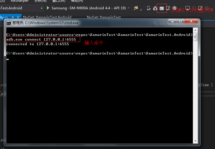 下载跟安装天天模拟器我就不说了,主要说一下怎么在VS中链接。因为直接打开Xamarin项目,是无法使用天天模拟器进行调试的,找不到设备。这时候我们需要点击菜单栏里的"打开adb命令提示符"图标,在命令提示符下输入