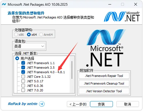 功能类别 参数 说明 静默模式 /VERYSILENT 完全无界面安装 工具调用 /R 仅运行修复工具 /CU 仅运行清理工具 /VD 仅运行版本检测 版本选择 /NetFw11 安装.Net 1.1 /NetFw4x 安装4.0-4.8.1系列 /NetAll 安装全部支持版本 架构选择 /X86_IA64 32位/IA64架构 /X64 64位架构 /Arm64 ARM64架构