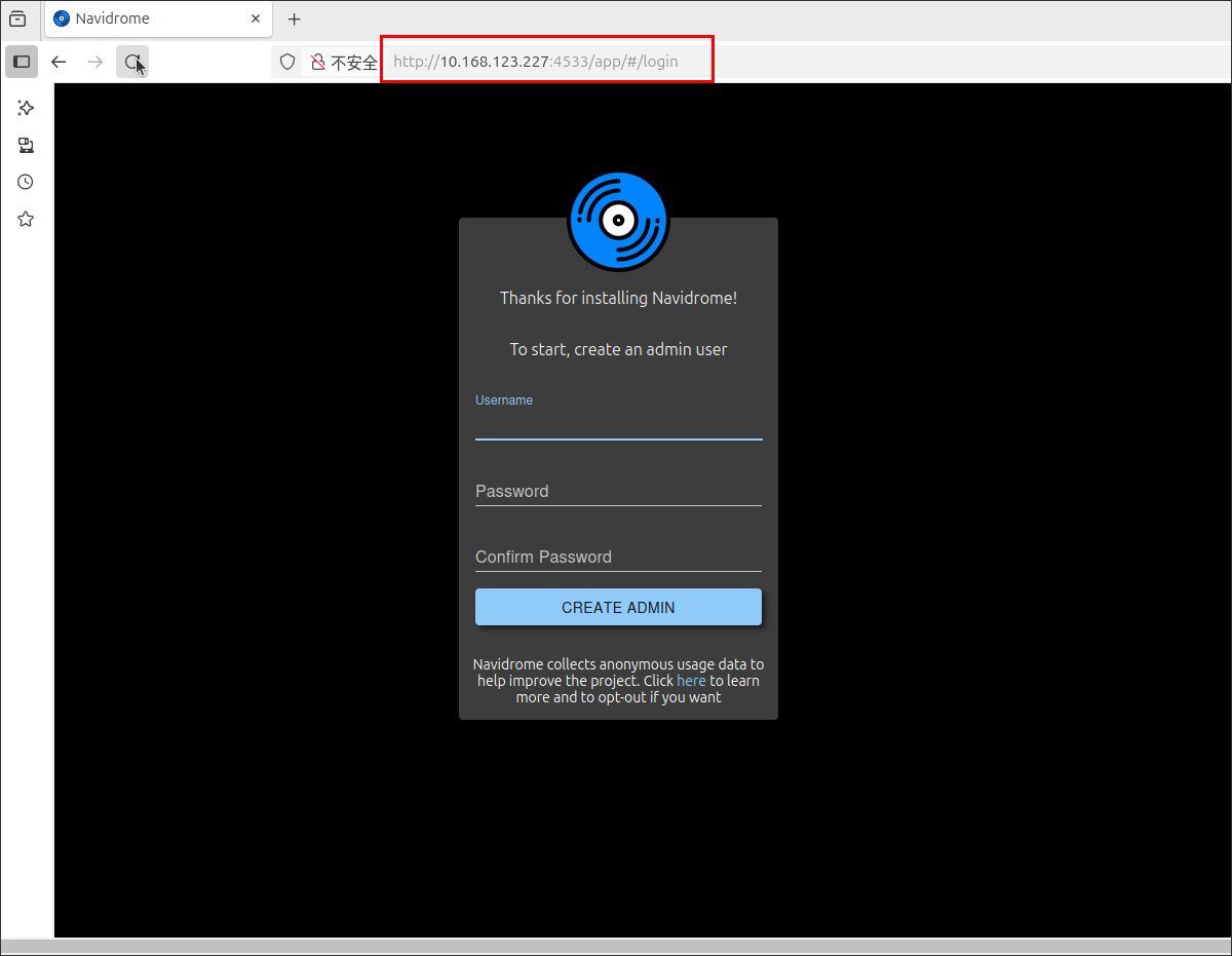 (4)运行完成后,在浏览器输入 http://本地IP:4533(本例http://10.168.123.227:6080),即可web访问Navidrome媒体服务器。首次登录需创建用户名及密码进行登录。