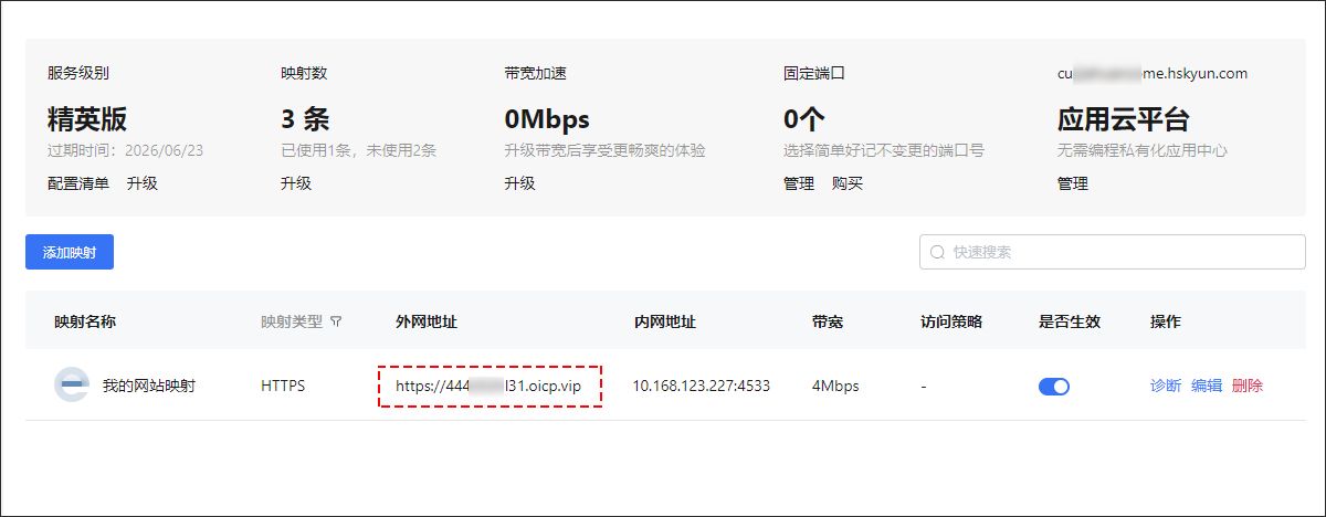 (1)激活成功后,点击【内网穿透】->【添加映射】,填写新增映射信息。