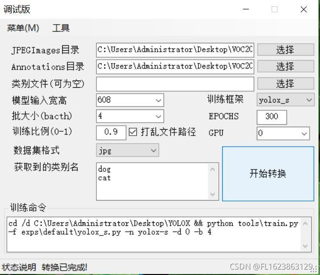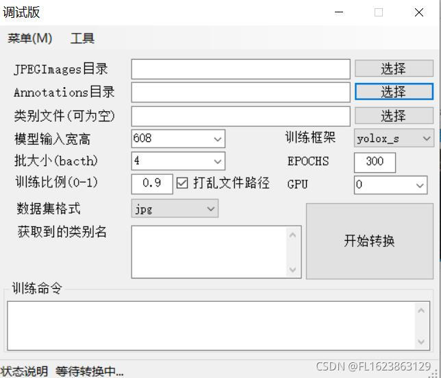 选择自己的图片和标注目录,注意图片格式要和软件界面数据集格式要一致,图片不能混合jpg,png图片,然后根据自己电脑显卡能力,选择batch size和模型输入宽高,点击开始转换后