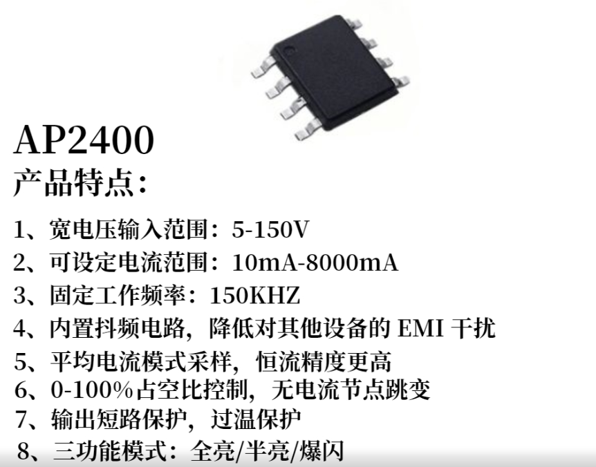 AP2400 是一款降压型恒流LED驱动芯片,采用PWM工作模式,专为宽电压输入的LED照明系统设计。它通过外置 MOS管驱动,支持大电流输出,适用于电动车灯、汽车照明、手电筒等场景。