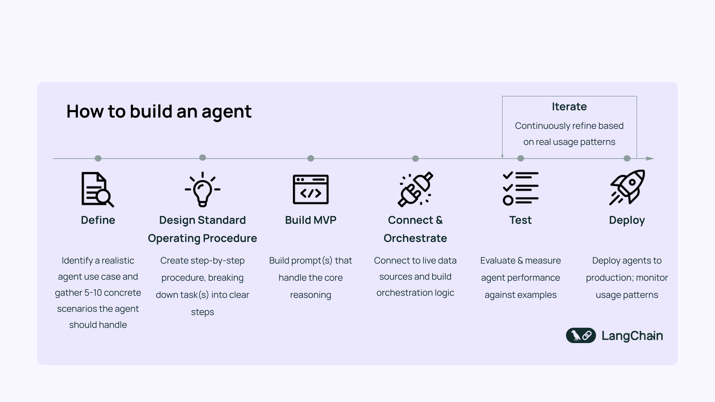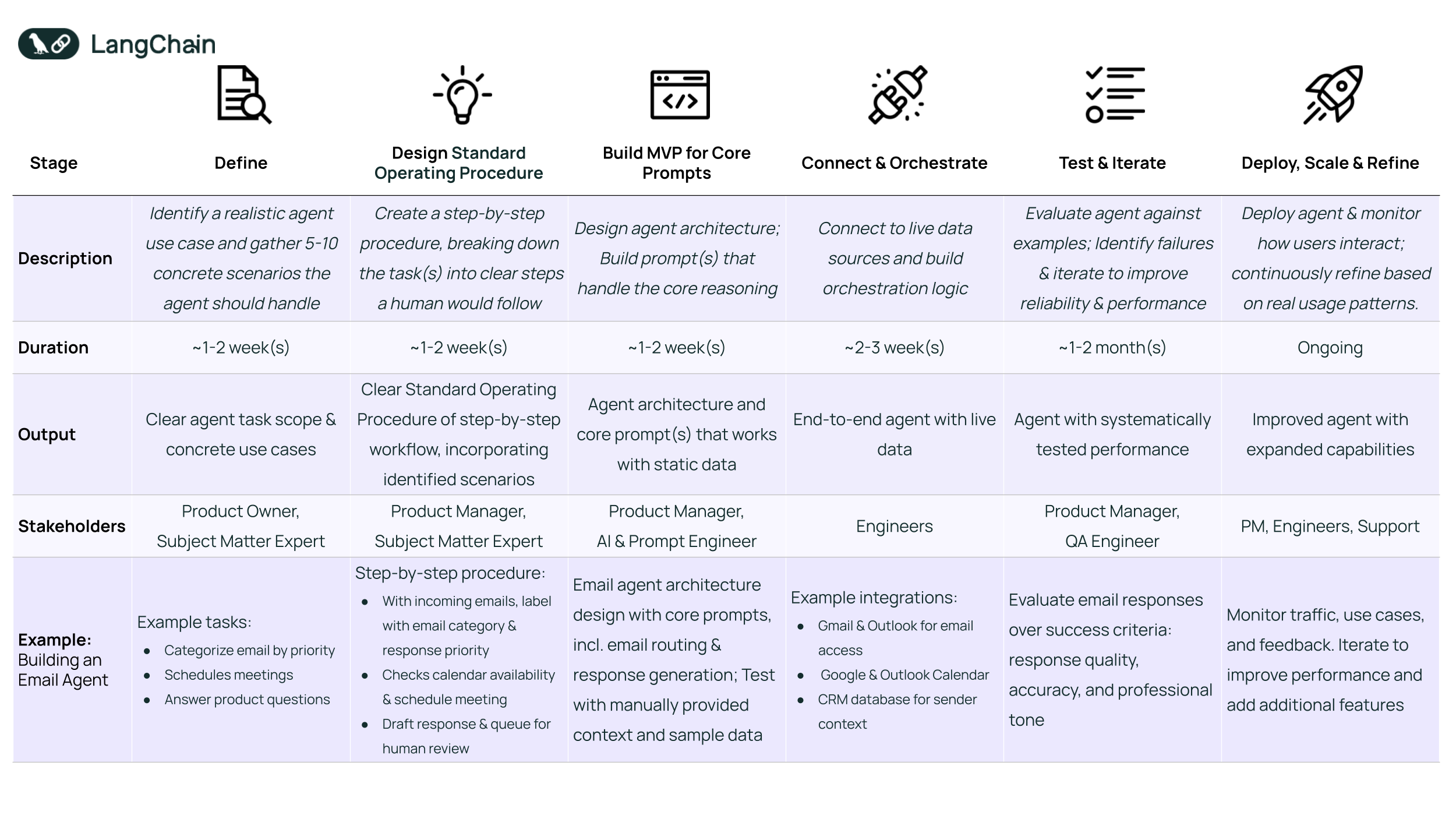 这个流程旨在帮助你构建基于清晰用例、对照真实示例进行测试并由实际反馈塑造的 Agent。这不仅仅是让 Agent 运行起来,而是要构建有益、可靠、与人们实际工作方式契合的东西。