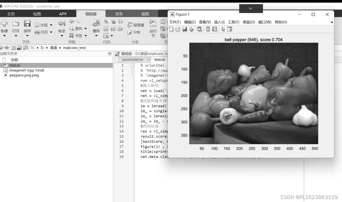 % urlwrite(... % 'http://www.vlfeat.org/matconvnet/models/imagenet−vgg−f.mat', ... % 'imagenet−vgg−f.mat'); run vl_setupnn %载入模型 net = load('imagenet-vgg-f.mat') ; net = vl_simplenn_tidy(net); %读取图像并预处理 im = imread('peppers.png') ; im_ = single(im) ; % note: 255 range im_ = imresize(im_, net.meta.normalization.imageSize(1:2)) ; im_ = im_ - net.meta.normalization.averageImage ; %得到结果 res = vl_simplenn(net, im_) ; result.scores = squeeze(gather(res(end).x)) ; [bestScore, best] = max(result.scores) ; figure(1) ; clf ; imagesc(im) ; title(sprintf('%s (%d), score %.3f',... net.meta.classes.description{best}, best, bestScore)) ;