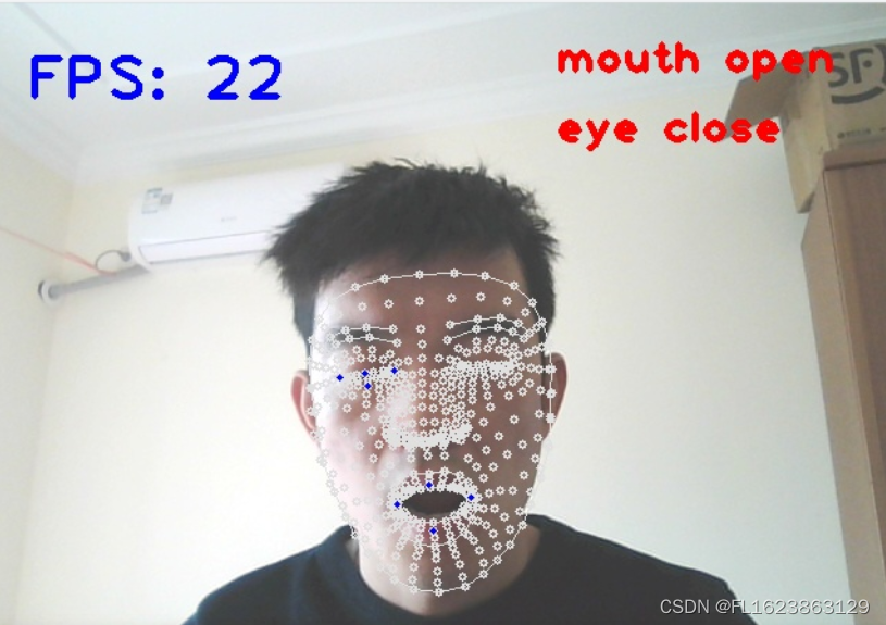 while True: success, img = cap.read() imgRGB = cv2.cvtColor(img, cv2.COLOR_BGR2RGB) results = faceMesh.process(imgRGB) if results.multi_face_landmarks: for faceLms in results.multi_face_landmarks: mpDraw.draw_landmarks(img, faceLms, mpFaceMesh.FACEMESH_CONTOURS, drawSpec,drawSpec) mp_data = [] for id,lm in enumerate(faceLms.landmark): ih, iw, ic = img.shape x,y = int(lm.x*iw), int(lm.y*ih) if id in id_list: #左眼[22, 23, 24, 26, 110, 157, 158, 159, 160, 161, 130, 243]: mp_data.append([x,y]) cv2.circle(img,(x,y),2,(255,0,0),-1) eye_length_1 = findDis(mp_data[0],mp_data[1]) eye_length_2 = findDis(mp_data[2],mp_data[3]) mouth_length_2 = findDis(mp_data[4],mp_data[5]) mouth_length_1 = findDis(mp_data[6],mp_data[7]) # print(eye_length_1,eye_length_2) if ((mouth_length_1/mouth_length_2)<(98/18)): cv2.putText(img,"mouth close",(400,50),cv2.FONT_HERSHEY_PLAIN, 2,(0,0,255),3) else: cv2.putText(img,"mouth open",(400,50),cv2.FONT_HERSHEY_PLAIN, 2,(0,0,255),3) if (eye_length_2/eye_length_1)>18: cv2.putText(img,"eye open",(400,100),cv2.FONT_HERSHEY_PLAIN, 2,(0,0,255),3) else: cv2.putText(img,"eye close",(400,100),cv2.FONT_HERSHEY_PLAIN, 2,(0,0,255),3)