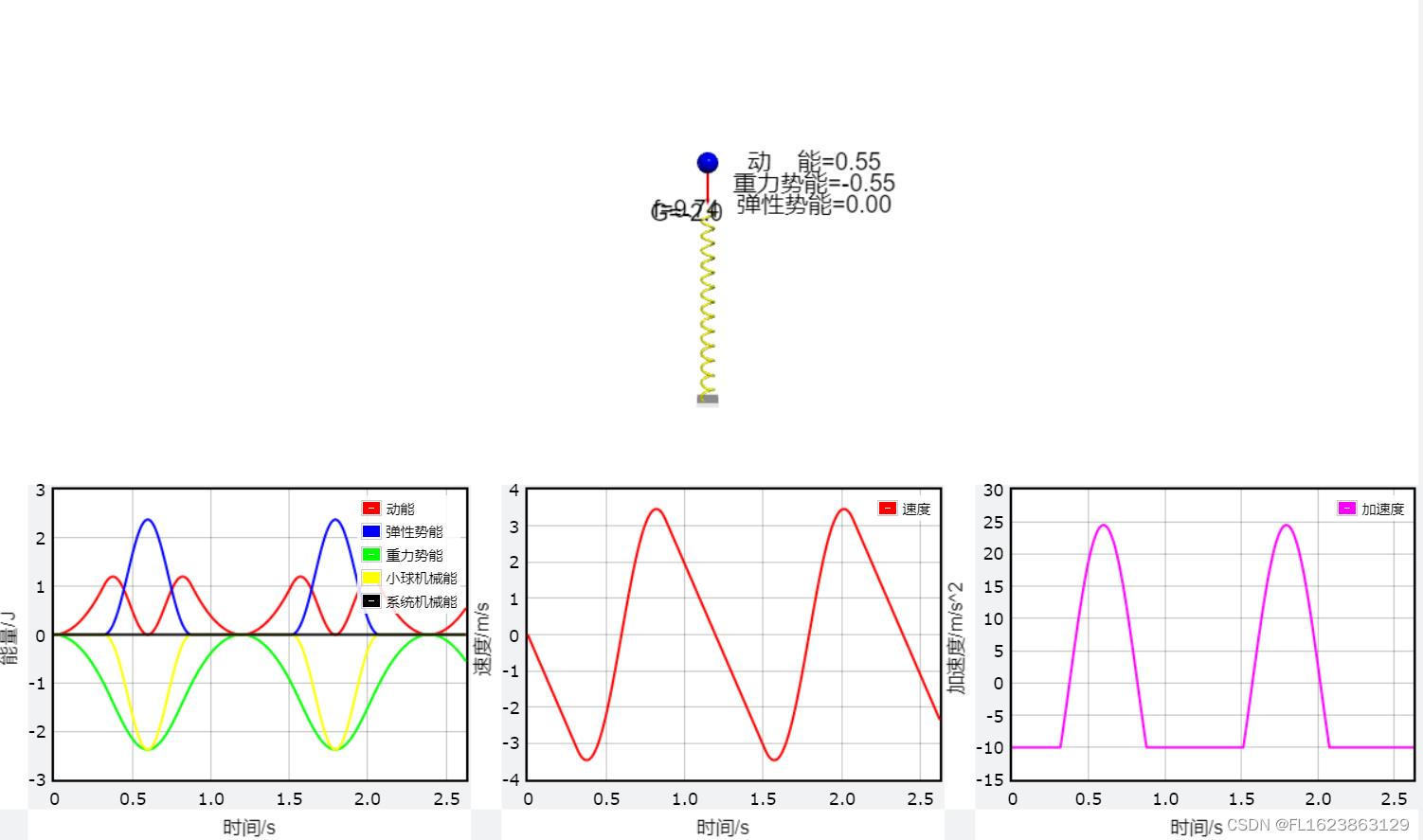 EEcurve = gcurve(color=color.yellow, graph=g1, label="小球机械能") # 定义小球机械能曲线